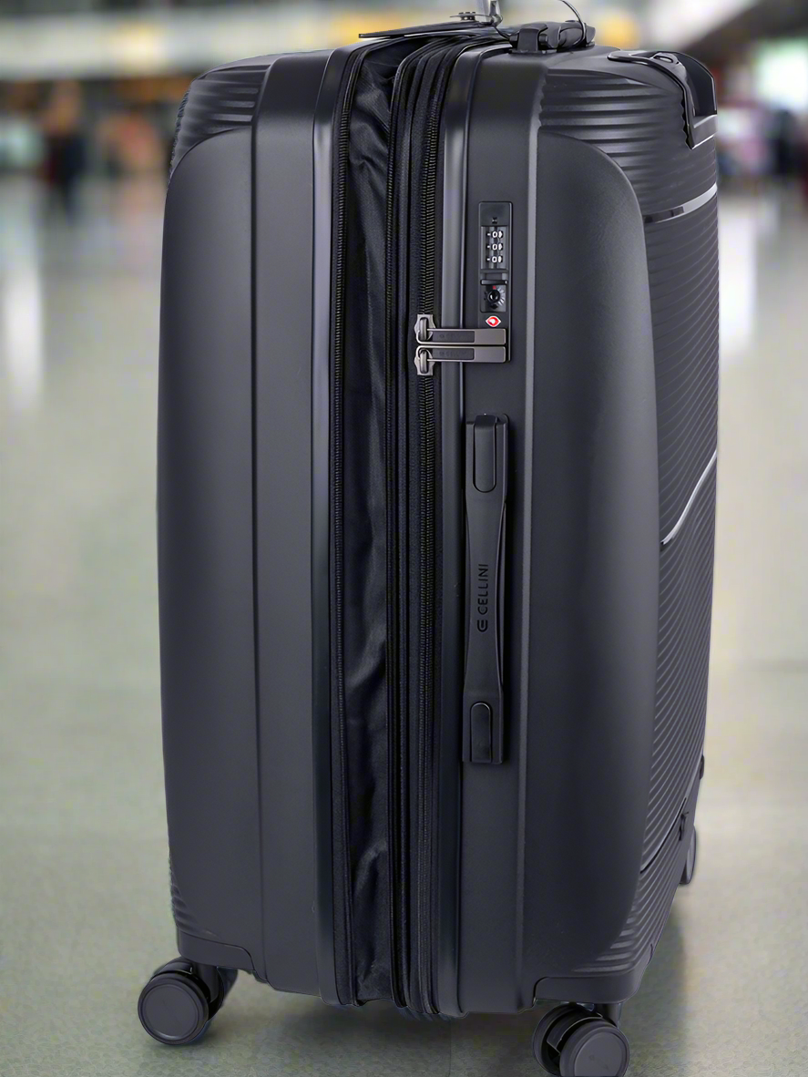 The Medium Trolley Case by Cellini Qwest offers ample packing space with a 20% increase in capacity, making it ideal for both business and leisure travel. Featuring 4 double-wheels and top and side handles, it ensures easy maneuverability. Made from sturdy polypropylene and available in German Red, Black, and Navy, this hardshell collection boasts gunmetal hardware and a bespoke ID tag for a stylish touch. Its interior is equipped with the Inside Story Packing System, including a wet pouch for damp items, and the Trakpouch compartment for secure storage of a luggage tracking device, enhancing organization and peace of mind while traveling.