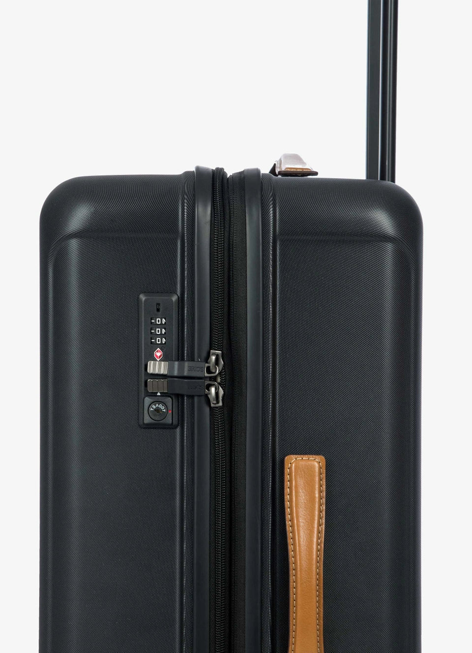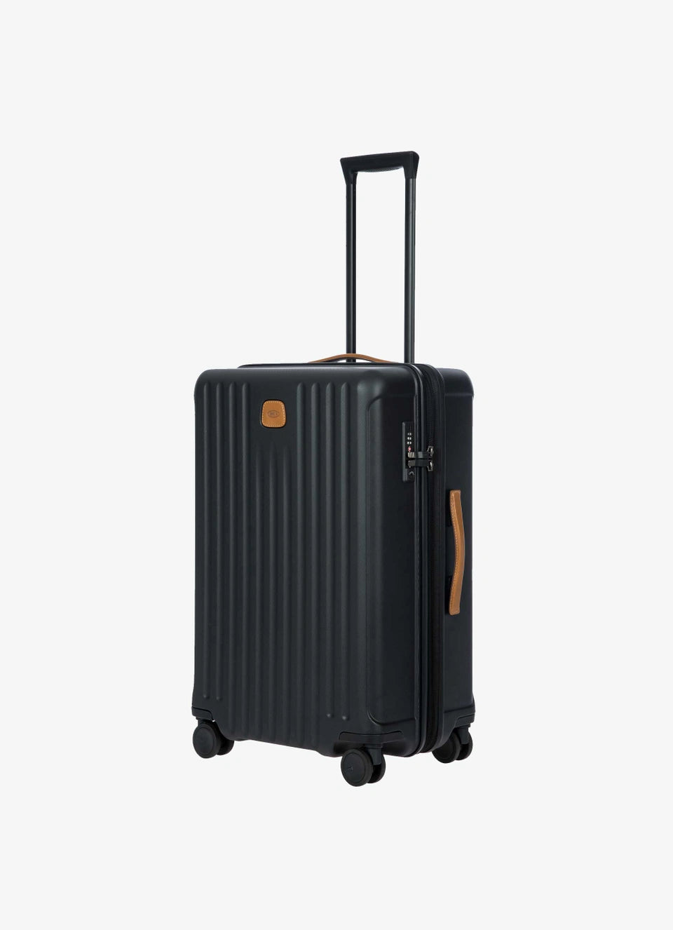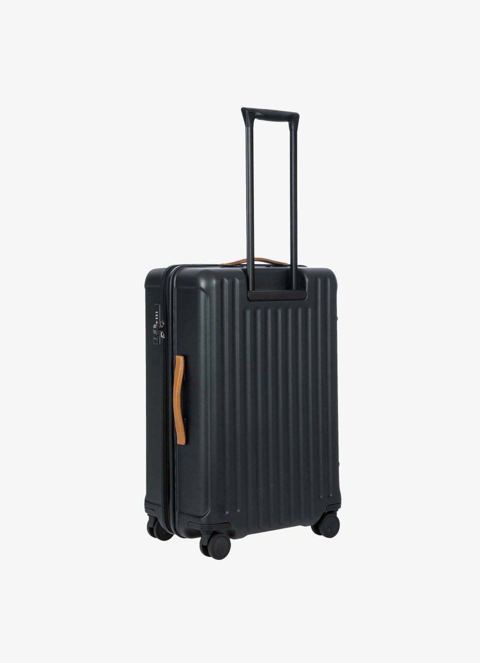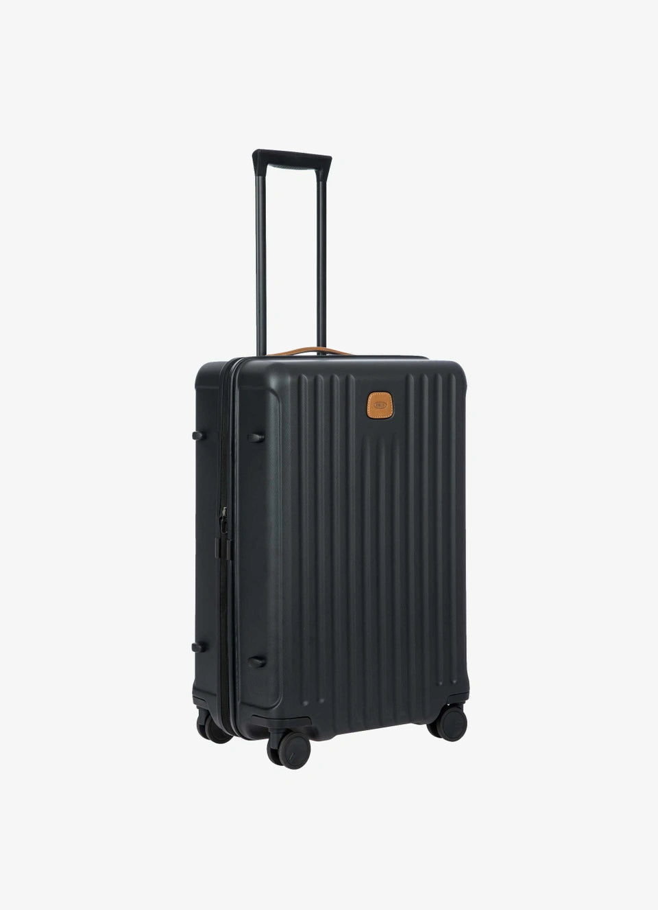 The medium Capri expandable hard-shell trolley offers a perfect blend of durability and practicality. Its polycarbonate shell is both flexible and strong, highlighted by cowhide details and contrasting top-stitching, with a TSA combination lock for added security. The expandable zipper adds an extra 4 cm of space when needed. The trolley features an aluminum pull-along handle with an ergonomic grip, along with leather top and side handles for easy carrying. Inside, you'll find a zipped double compartment with polyester straps and a garment hook for added organization. Its four recessed, 360° swivel wheels provide smooth, quiet movement and enhanced stability, with easily replaceable wheels for long-term use.