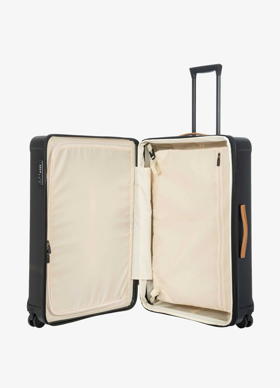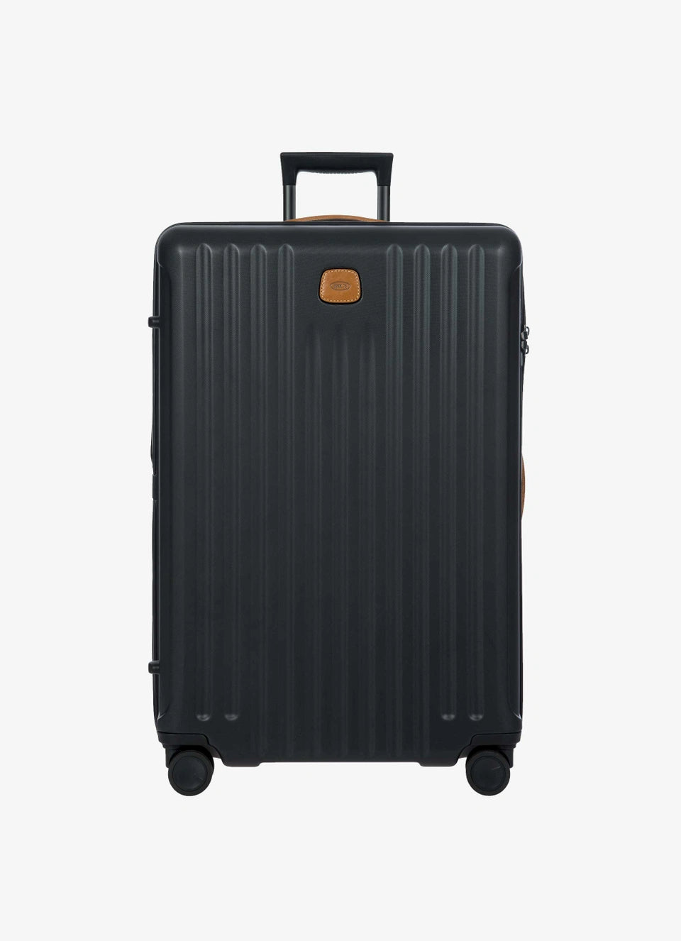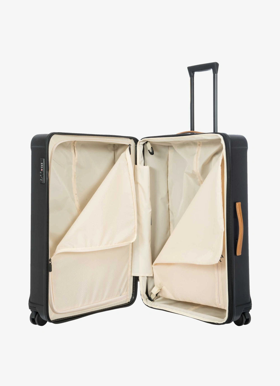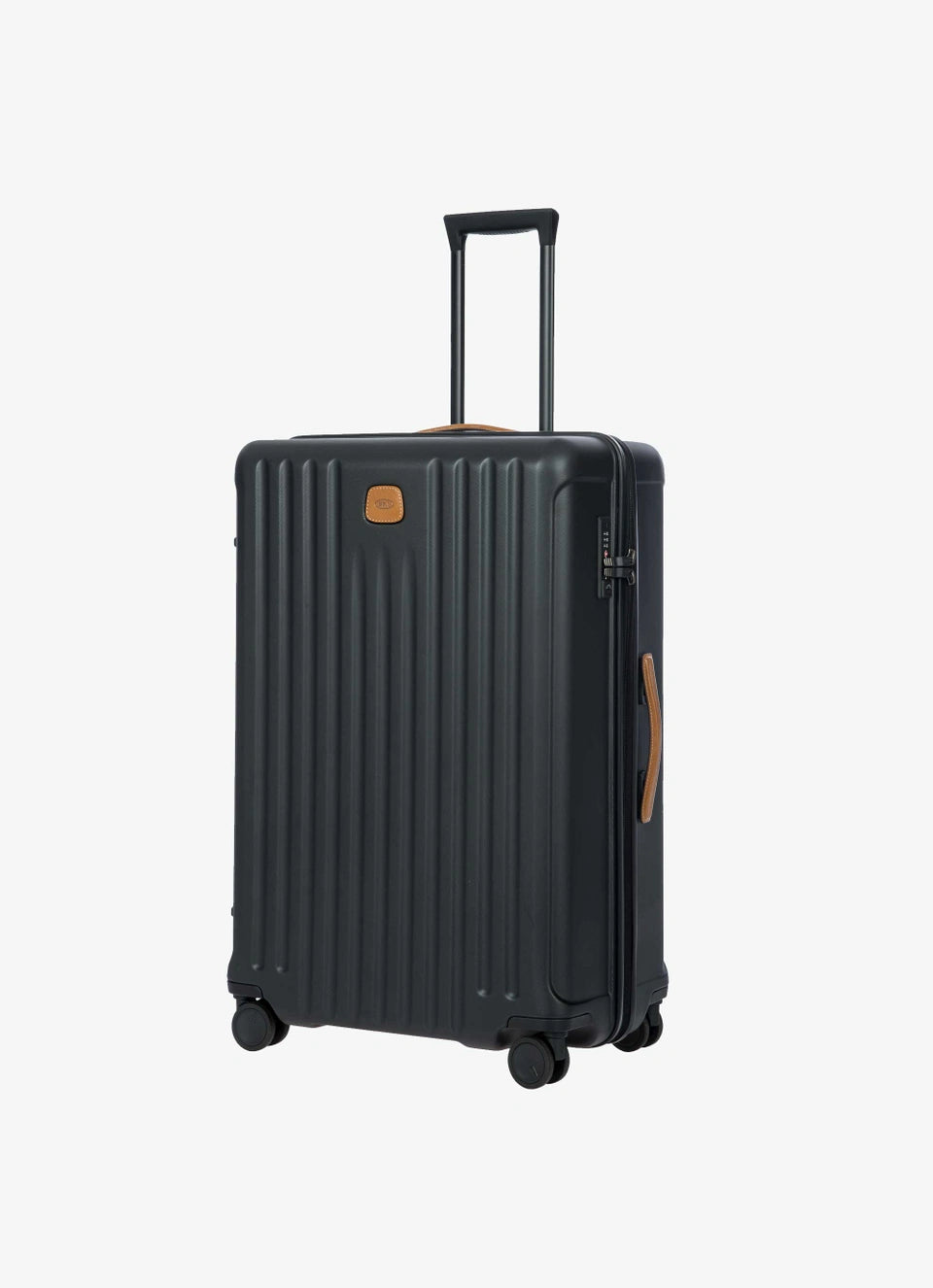 The large Capri expandable hard-shell trolley combines durability, functionality, and style. Crafted from a flexible polycarbonate shell with cowhide accents and contrasting top-stitching, it includes a TSA combination lock for security. The expandable zipper offers an additional 4 cm of space when needed. The trolley features a sturdy aluminum pull-along handle with an ergonomic grip and a leather top handle for added convenience. Inside, a zipped double compartment with polyester straps and a garment hook ensures organized packing. Its four recessed 360° swivel wheels provide smooth and quiet maneuverability.