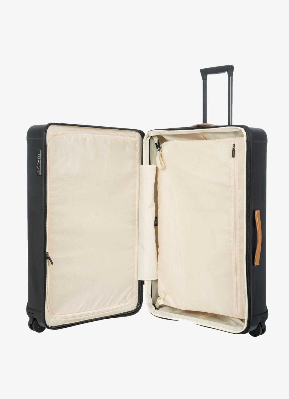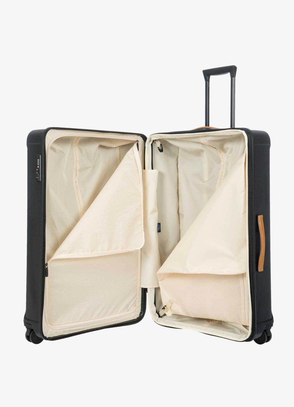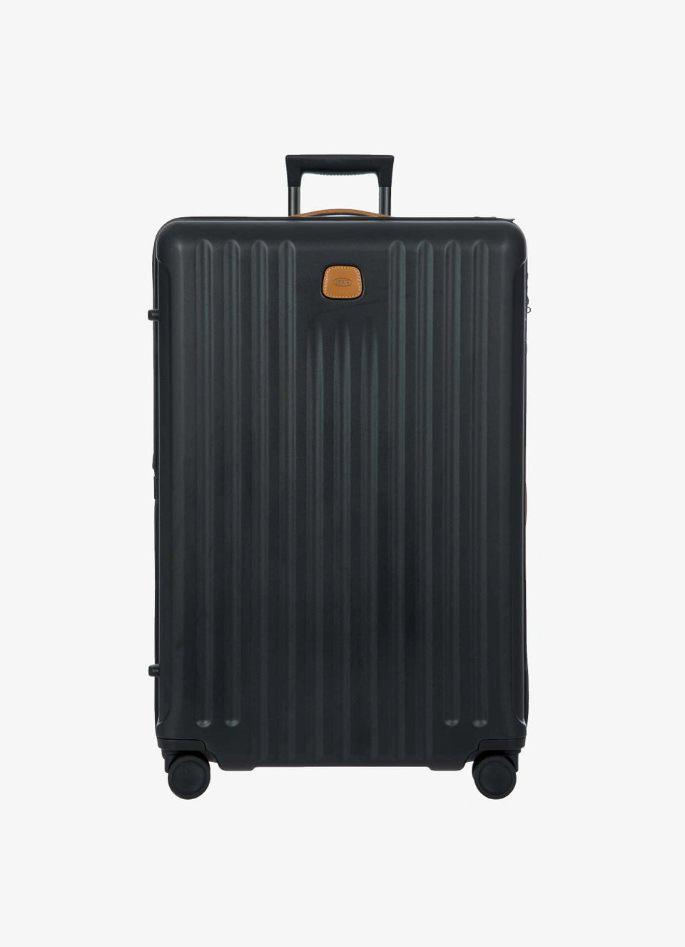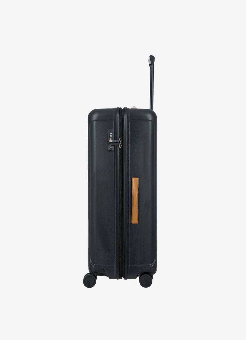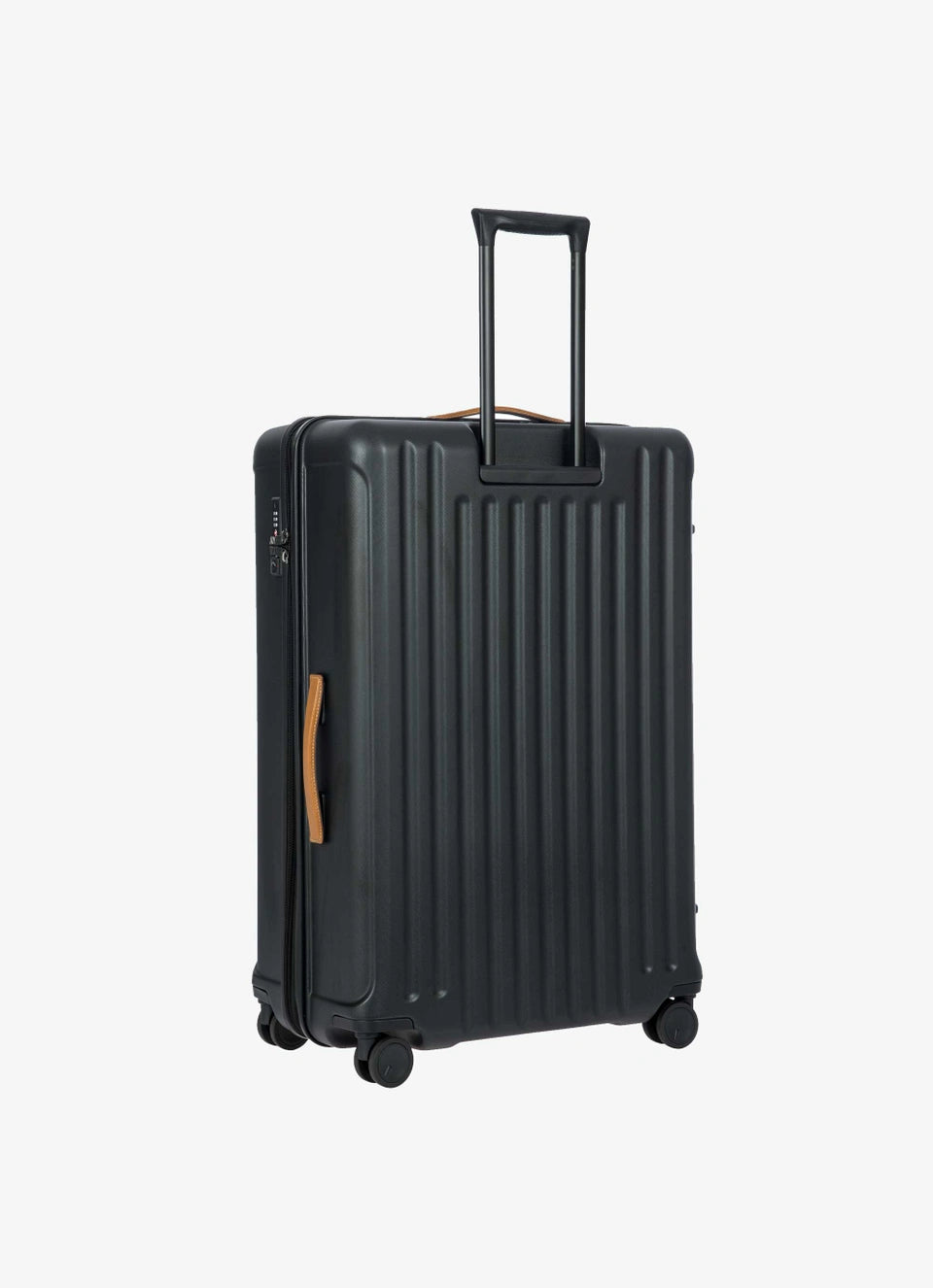 The large Capri expandable hard-shell trolley offers a balance of durability and sophistication. Featuring a flexible polycarbonate shell with cowhide accents and contrasting top-stitching, it includes a built-in TSA combination lock for enhanced security. The expandable zipper allows for an additional 4 cm of packing space. Its aluminum pull-along handle with ergonomic grip and leather top handle ensures easy handling. Inside, the trolley is designed with a zipped double compartment, polyester straps, and a garment hook for optimal organization. Equipped with four recessed 360° swivel wheels, it ensures silent and smooth movement.