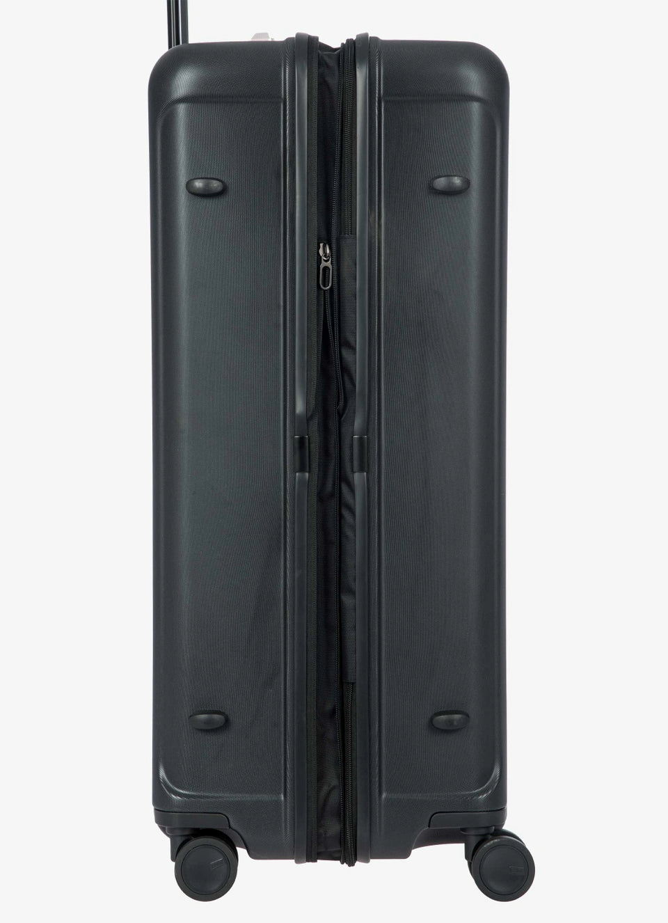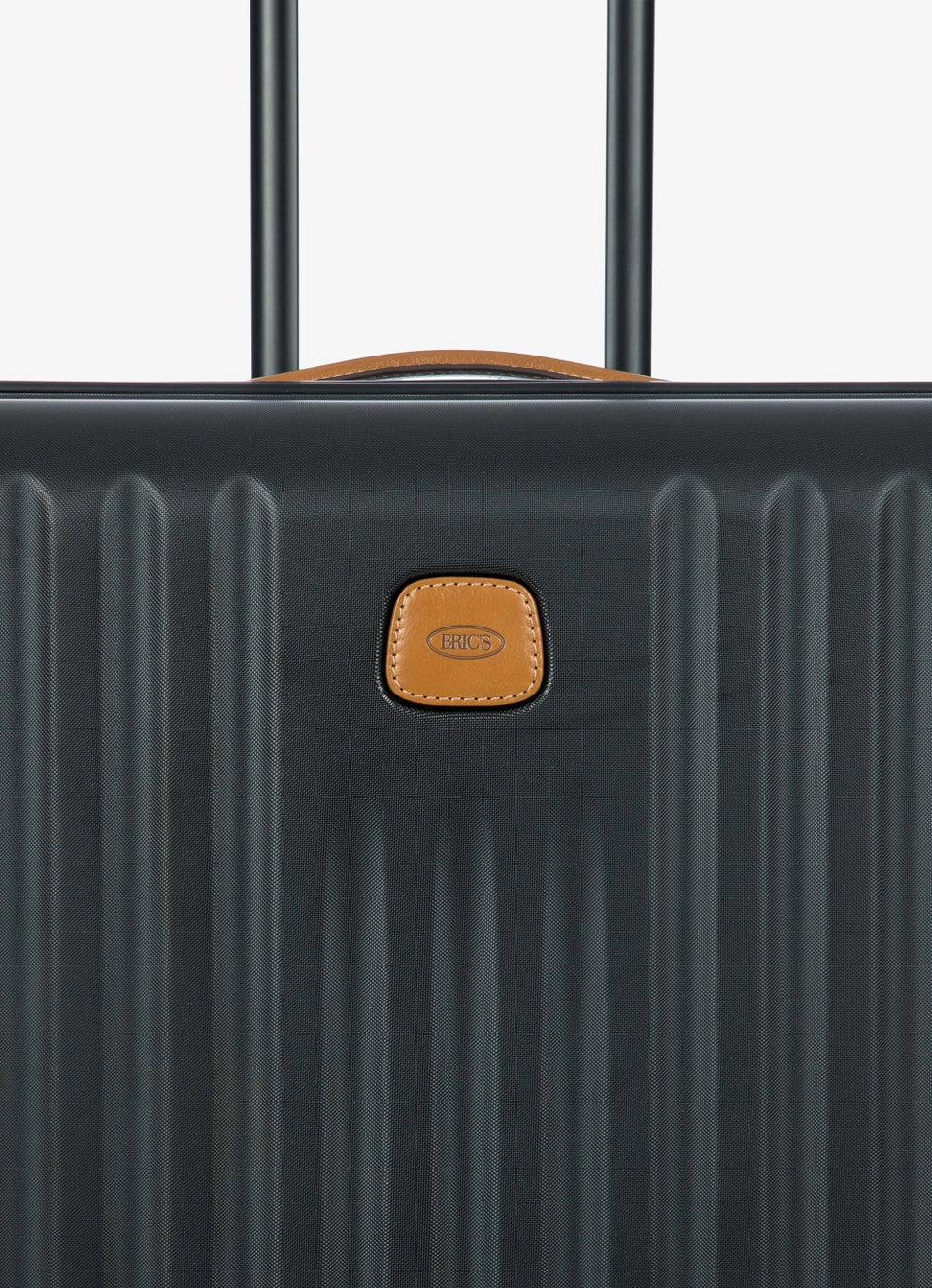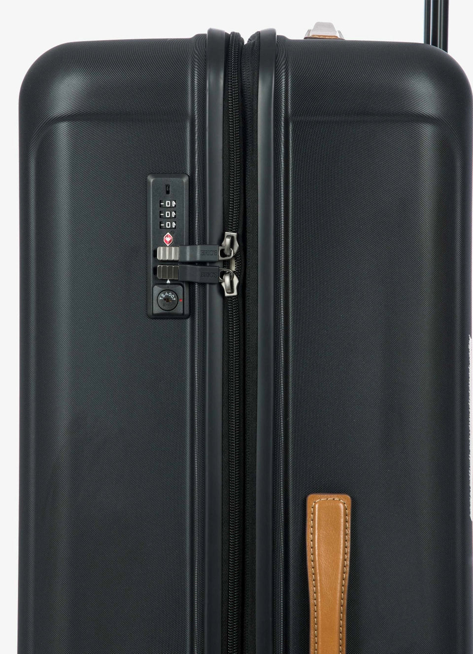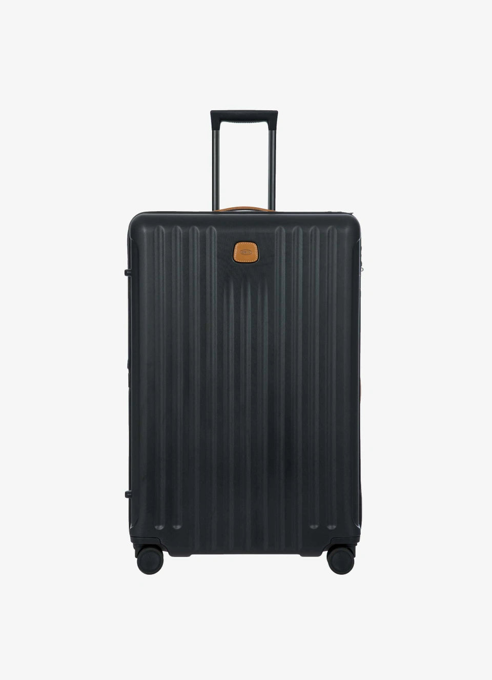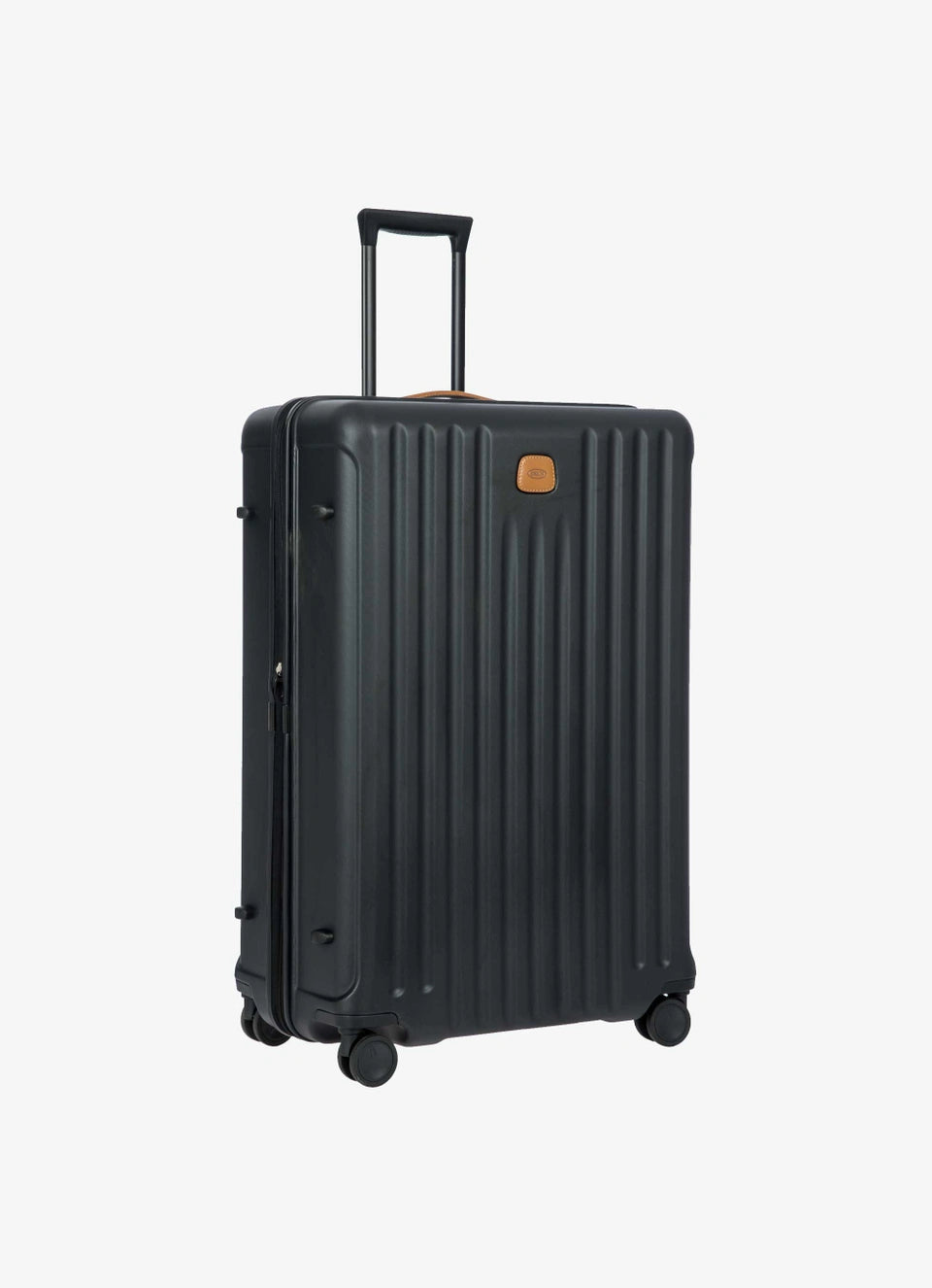 The large Capri expandable hard-shell trolley offers a balance of durability and sophistication. Featuring a flexible polycarbonate shell with cowhide accents and contrasting top-stitching, it includes a built-in TSA combination lock for enhanced security. The expandable zipper allows for an additional 4 cm of packing space. Its aluminum pull-along handle with ergonomic grip and leather top handle ensures easy handling. Inside, the trolley is designed with a zipped double compartment, polyester straps, and a garment hook for optimal organization. Equipped with four recessed 360° swivel wheels, it ensures silent and smooth movement.