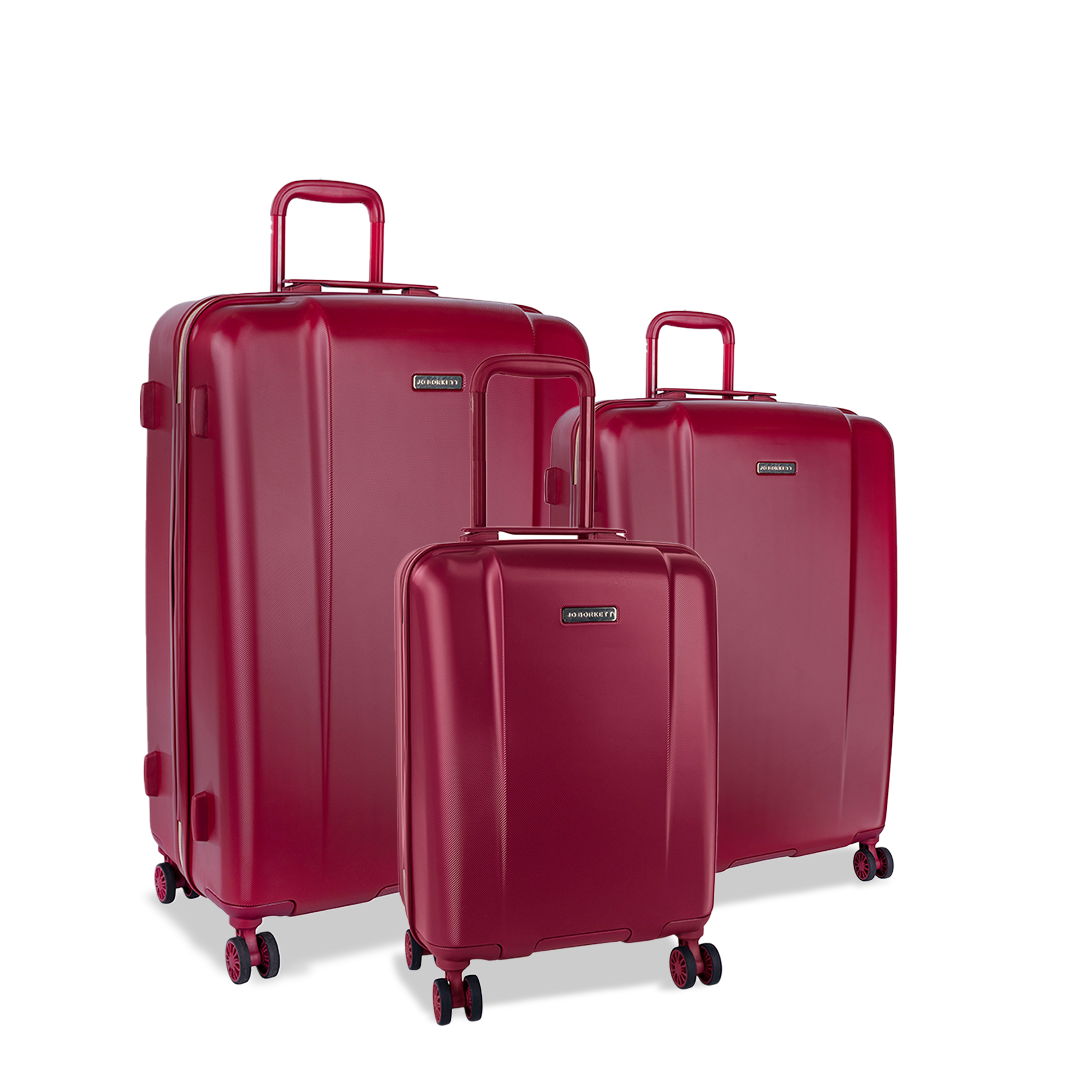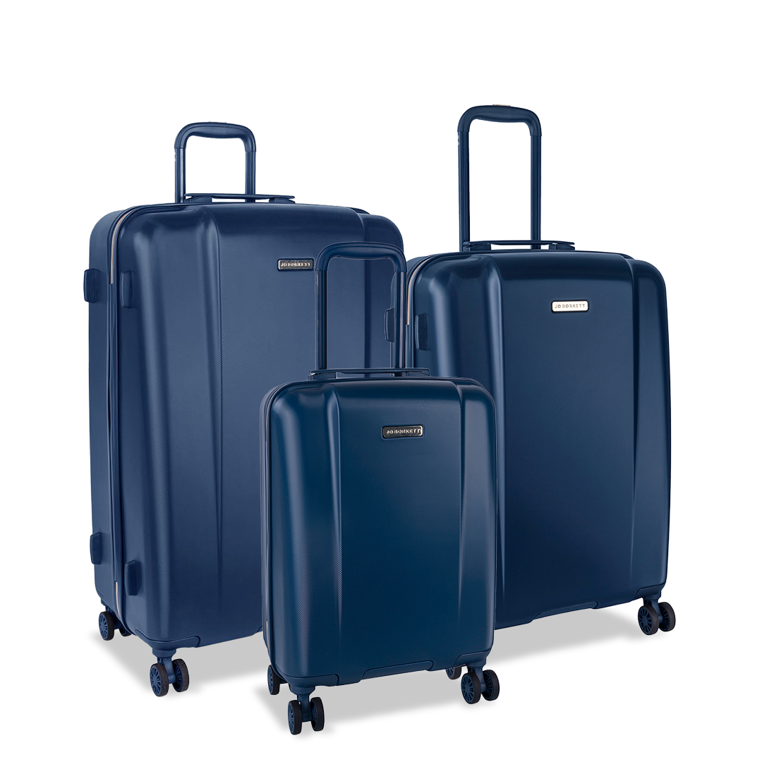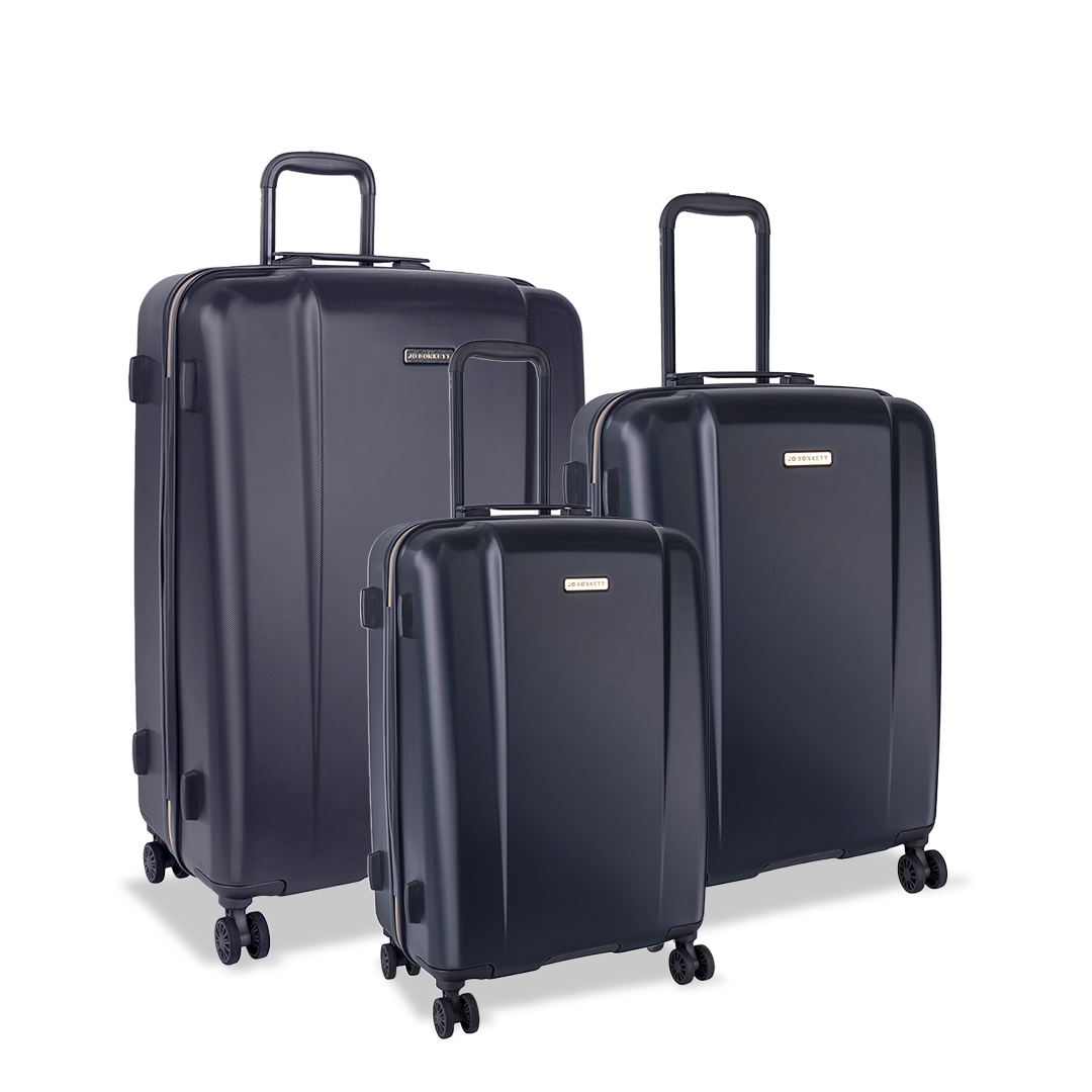 Embark on your travels with the stylish Jo Borkett Nouveau Luggage Set, designed to cater to all your packing needs with a sleek, coordinated look. Each set includes a variety of sizes, all featuring 4 double glider wheels for smooth maneuverability, along with top and side carry handles for convenience. The interior of each piece is adorned with a vibrant red lining and equipped with elastic tie-down straps for secure packing. Inspired by Art Deco elegance with a modern flair, this collection is available in Twilight Blue, Merlot, and Dark Slate, complemented by soft gold hardware for a timeless, sophisticated finish. Perfect for travelers seeking both functionality and style.