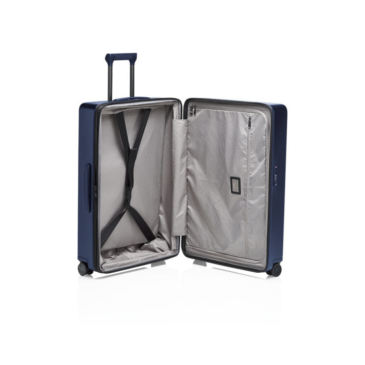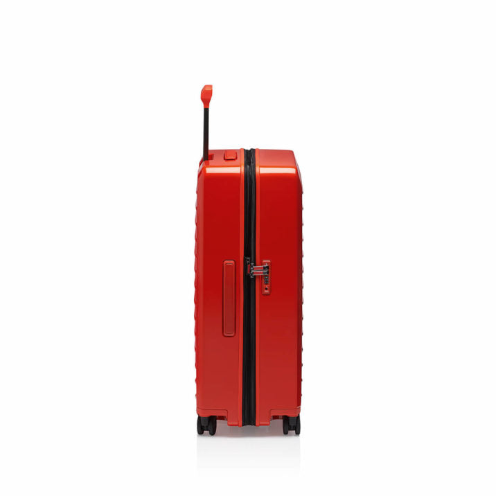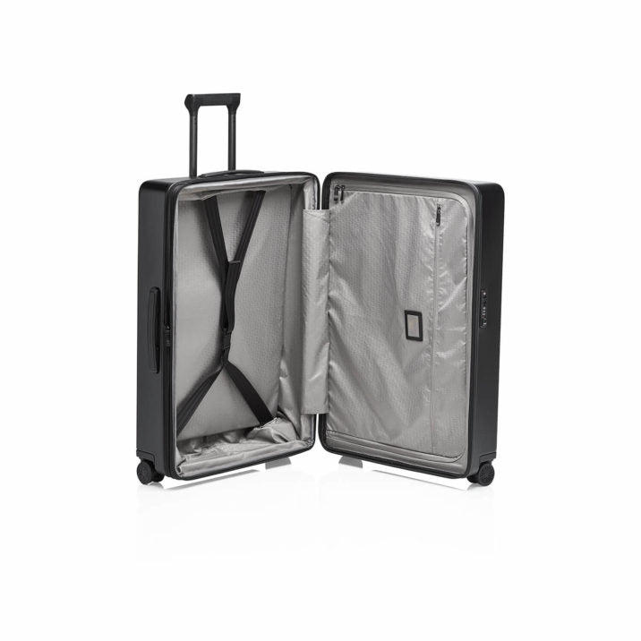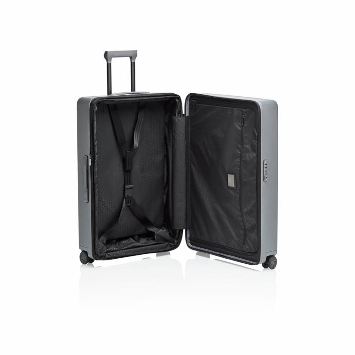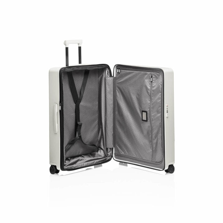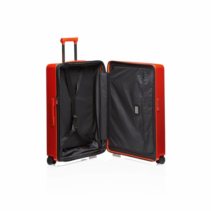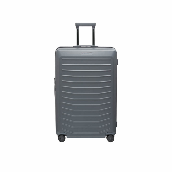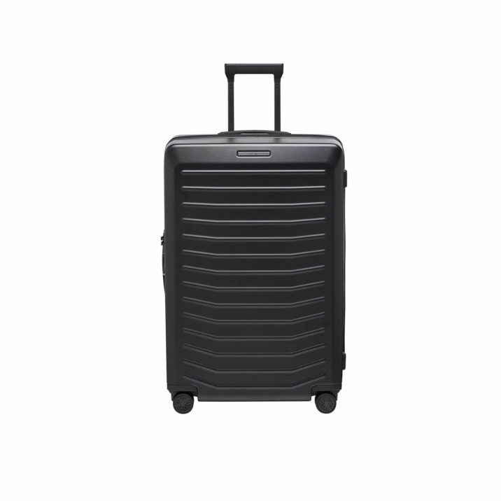 An elegantly designed 4-wheeled cabin trolley crafted from lightweight plastic, the exclusive Porsche Design Roadster Hardcase offers smooth, silent-running wheels, integrated TSA-approved security, and a beguiling monochrome aesthetic inspired by the iconic Porsche 911. Boasting a featherweight 3.0 kg and the signature details of Studio F. A. Porsche, this hardcase collection is the perfect union of form, function, and style. The cabin-sized trolley's Taycan rims are ball-bearing-mounted for maximum maneuverability, while an ergonomic handle ensures an effortless journey. Inside, a divided storage space lined with signature PD fabric awaits, secured by a two-way zipper and a TSA-approved lock.