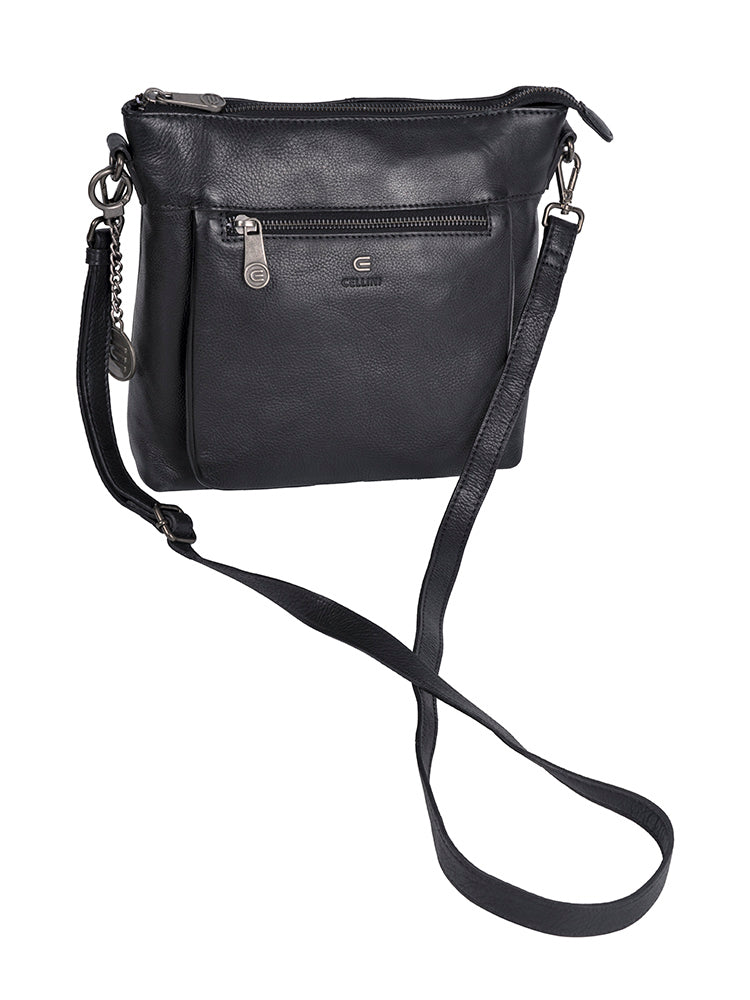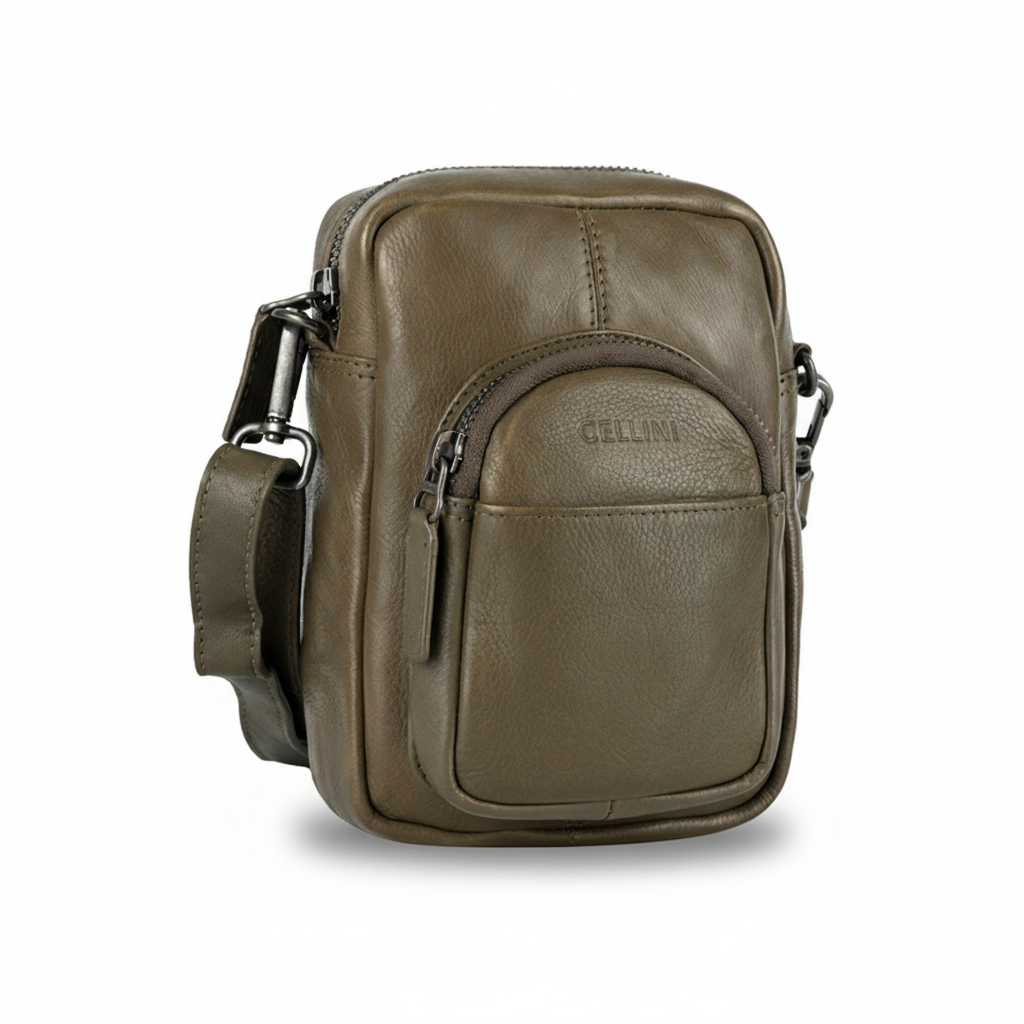 The soft smooth leather Compact Crossbody is made with the modern minimalist in mind. Carry this useful accessory comfortably using the detachable and adjustable shoulder strap. The main compartment features a metal zip closure and offers an interior matching lining with internal zip and slip pockets. There is also a front compartment with zip closure for easy access. This fabulously functional a bag is part of the Cellini Diva collection and is available in Black, Olive and Tan with gun metal hardware and an embossed Cellini logo to complete the classic look.