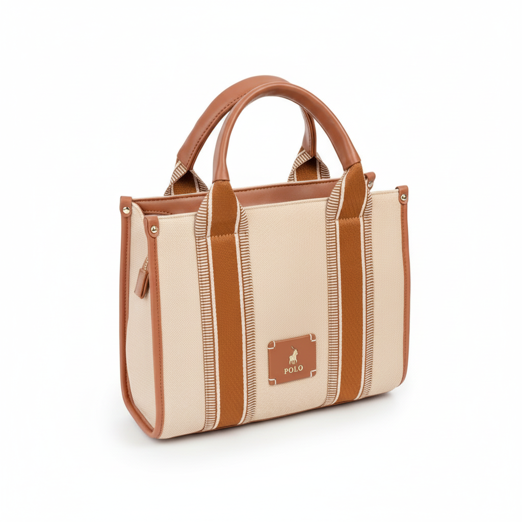 The Polo Tahiti Small Shopper is the perfect choice to update your accessory collection. Carry it using the top handles or use the adjustable long shoulder strap for added versatility. The Polo Tahiti collection is available in Cream with Tan or Navy trim and a matching square Polo logo to offer wide-ranging appeal.